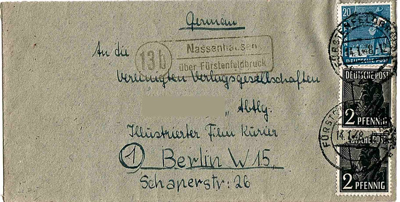 - ab ca. 1945 bis ca. 1963 Zweizeiliger Kastenstempel mit Postgebietszahl 13b (s.u.)