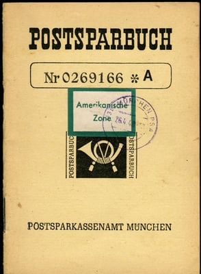 Ab Juli 1948 sehen die vom PSA ausgegebenen Postsparbücher so aus, so genannte "gelbe PSpB", für die Amerikanische Zone ein weißer Aufkleber mit grüner Schrift.