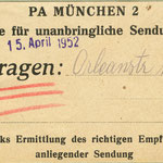 Es sind Bearbeiterstempel aus dem PA München 2, Nachforschungsstelle, vor. Diese Briefe sind selten. Auch nach langem suchen komme ich nur auf eine zweistellige Zahl und jedes unscheinbare Angebot auf den bekannten Plattformen wird freudig beliebäugt. Die Seltenheit ist nicht nur dadurch bedingt, dass zunächst der Absender keine oder eine unzureichende Adresse aufgeschrieben haben muss, sondern dann auch den Weg in Sammlerhände gefunden haben muss. Ich kann mir vorstellen, dass absolut unzustellbare Sendungen, die auch nicht an den Absender zurückgingen, entsorgt wurden und auch, dass es sich um so gewöhnliche (Dauerserien-)Belege handelte, die als nicht sammelwürdig in den Briefkasten flogen. Auch bei den Händlern achtet kaum jemand auf diese gesonderten Stempel.