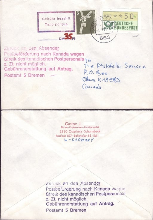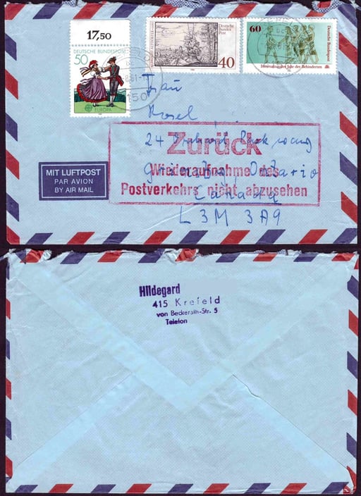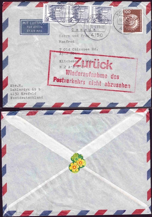 Postsendungen konnten nach Kanada infolge des ab 01. Juli 1981 beginnenden Poststreiks des kanadischen Postpersonals nicht befördert werden. Postkunden hatten die Möglichkeit, sich die